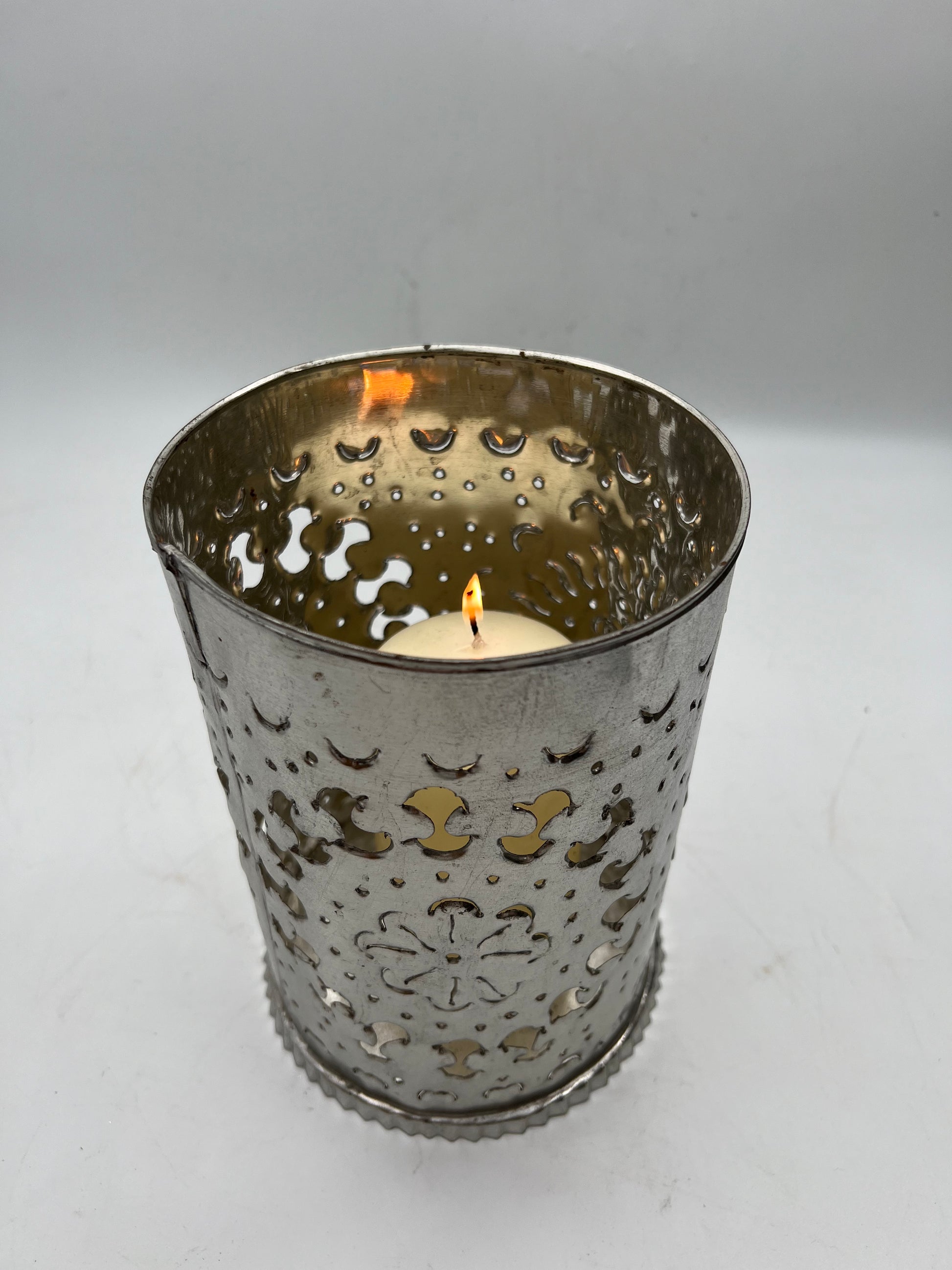 Beautiful silver handcrafted tin lamp. Tin artisans have a very unique handcrafting process when it comes to creating these beautiful tin lamps with fascinating colors and patterns. Generations of cultural artisan swap between European nations and native Mexican techniques have yielded as a result some one of a kind lamps that can't be found anywhere else in the world.