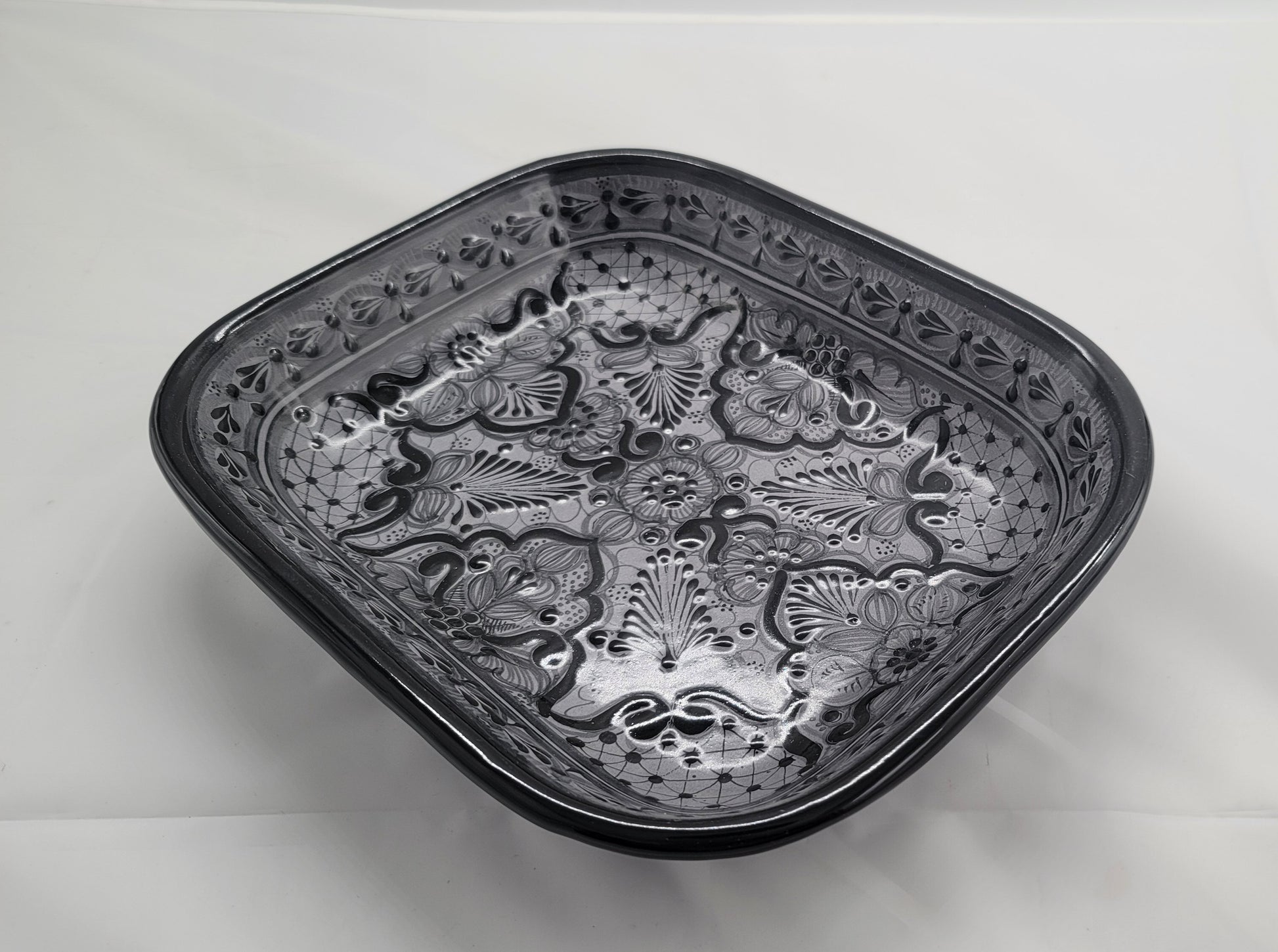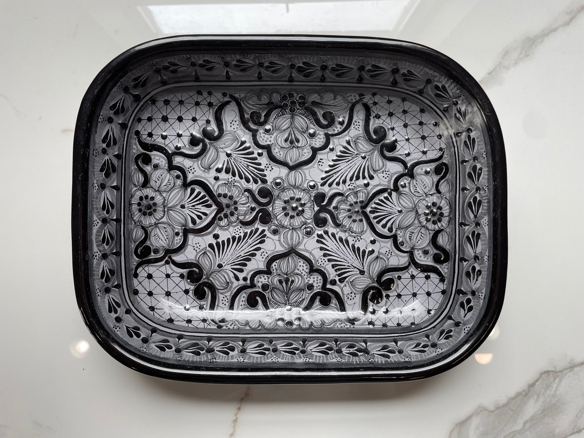 Beautiful black Talavera decorative tray. Known for its good artisan quality, Mexican Talavera ceramic products are part of the best of the world. Thanks to centuries of a huge cultural swap coming all the way from the Arabian peninsula, and then passing through the Iberic peninsula, Mexican Talavera artists have perfected and achieved a unique method that yields some fascinating and beautiful designs that will elevate the perception of your home.