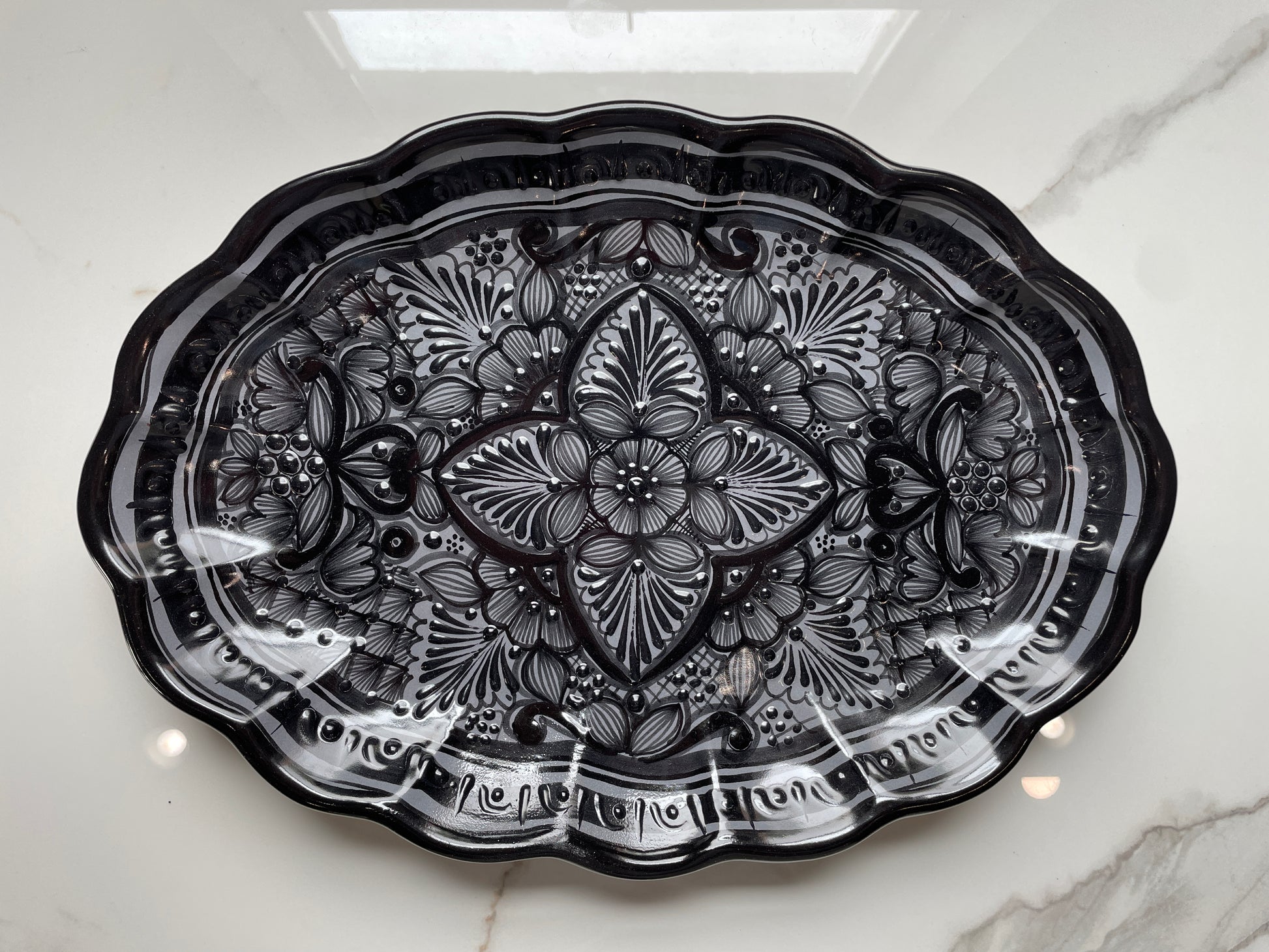 Beautiful black Talavera decorative tray. Known for its good artisan quality, Mexican Talavera ceramic products are part of the best of the world. Thanks to centuries of a huge cultural swap coming all the way from the Arabian peninsula, and then passing through the Iberic peninsula, Mexican Talavera artists have perfected and achieved a unique method that yields some fascinating and beautiful designs that will elevate the perception of your home.