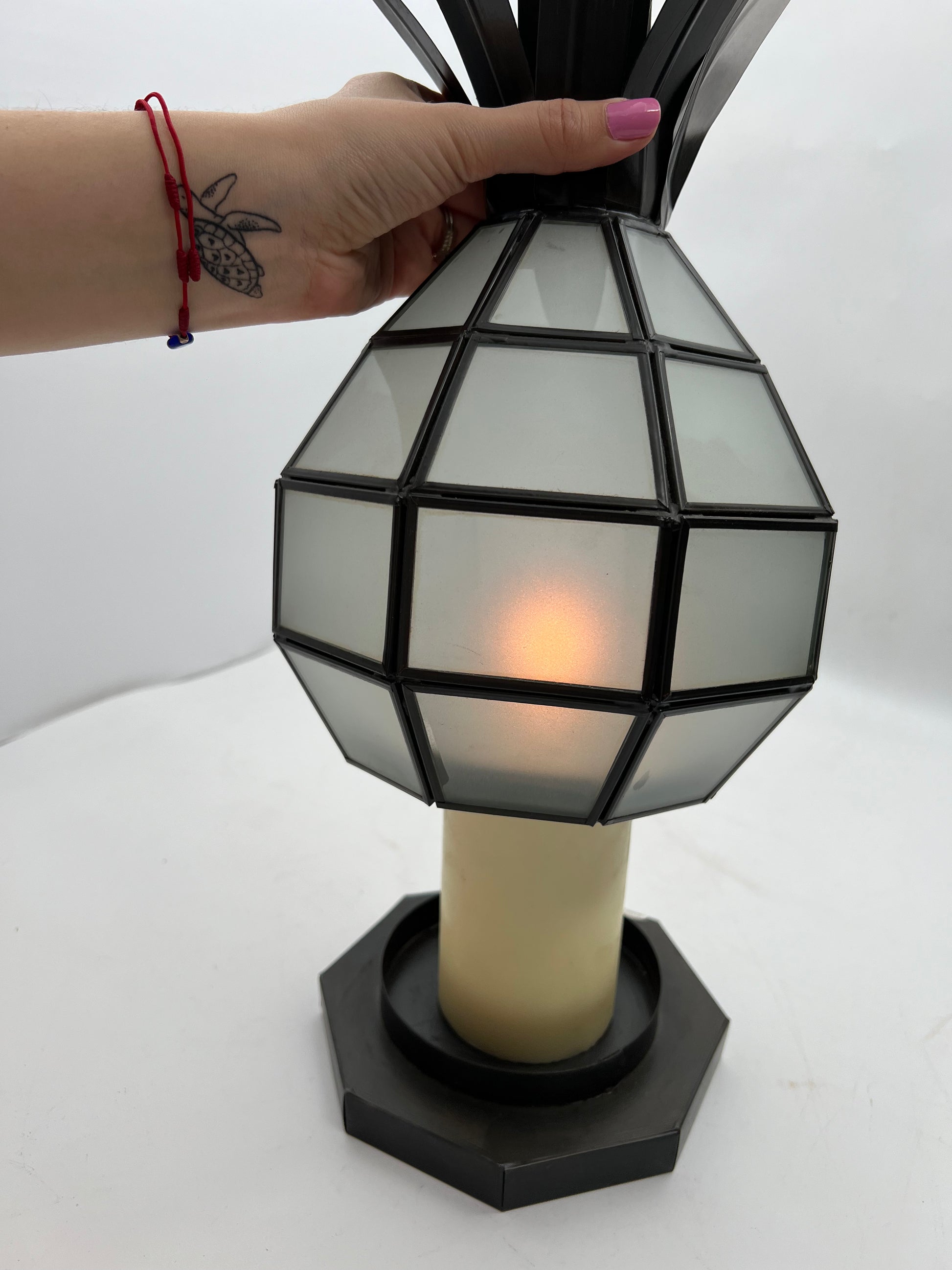 Beautiful opaque blue handcrafted pineapple tin lamp. Tin artisans have a very unique handcrafting process when it comes to creating these beautiful tin lamps with fascinating colors and patterns. Generations of cultural artisan swap between European nations and native Mexican techniques have yielded as a result some one of a kind lamps that can't be found anywhere else in the world.