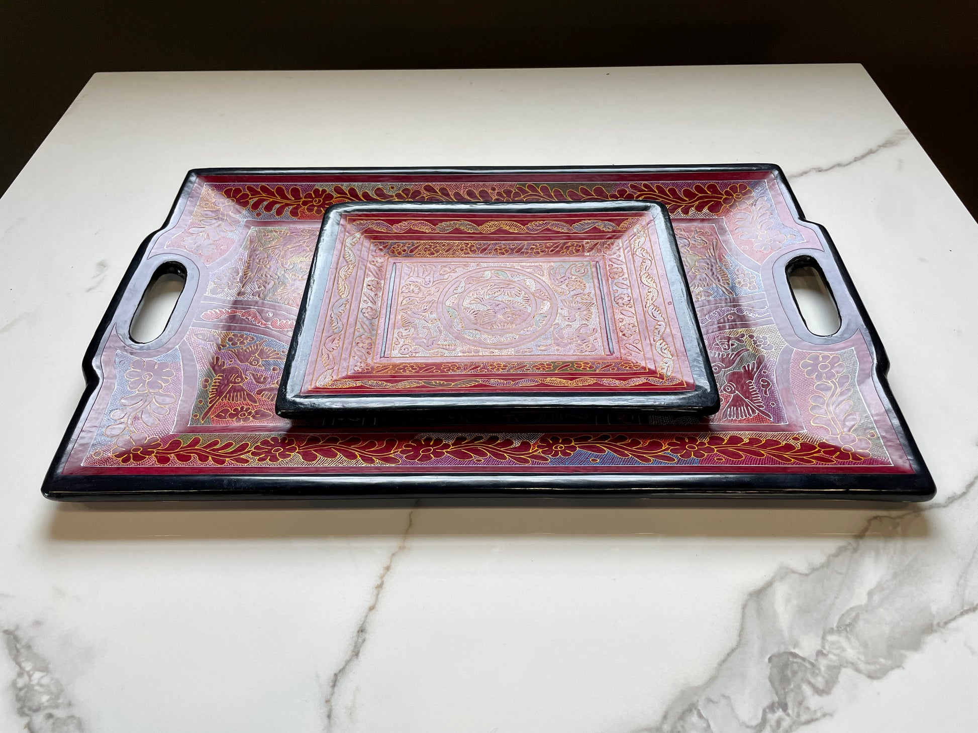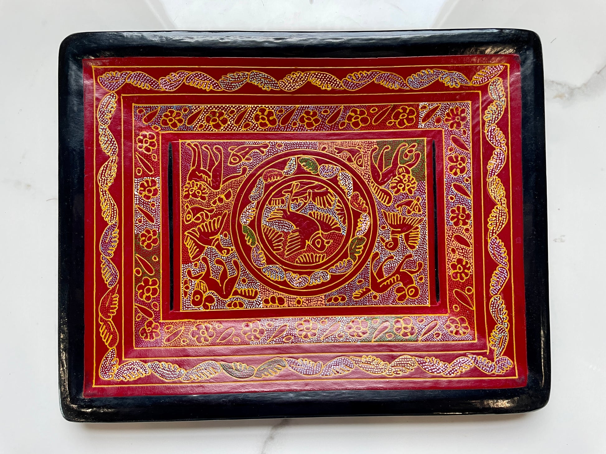 Beautiful red and black wooden patterned tray made as a piece of art. Our unique Special Items collection features some of the most iconic and valued both artistic and artisan Mexican products that represent both ancient cultural decorative fashion, as well as modern high quality decorative items that will elevate your home into a stylish place, or a culturally rich environment. All coming from the best artisans and artists from Mexico.