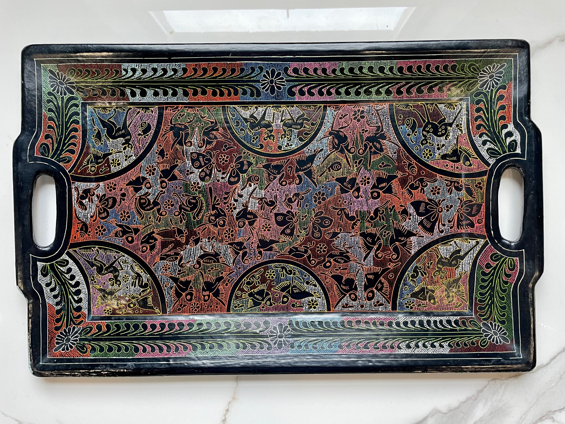 Beautiful multicolor wooden patterned tray made as a piece of art. Our unique Special Items collection features some of the most iconic and valued both artistic and artisan Mexican products that represent both ancient cultural decorative fashion, as well as modern high quality decorative items that will elevate your home into a stylish place, or a culturally rich environment. All coming from the best artisans and artists from Mexico.