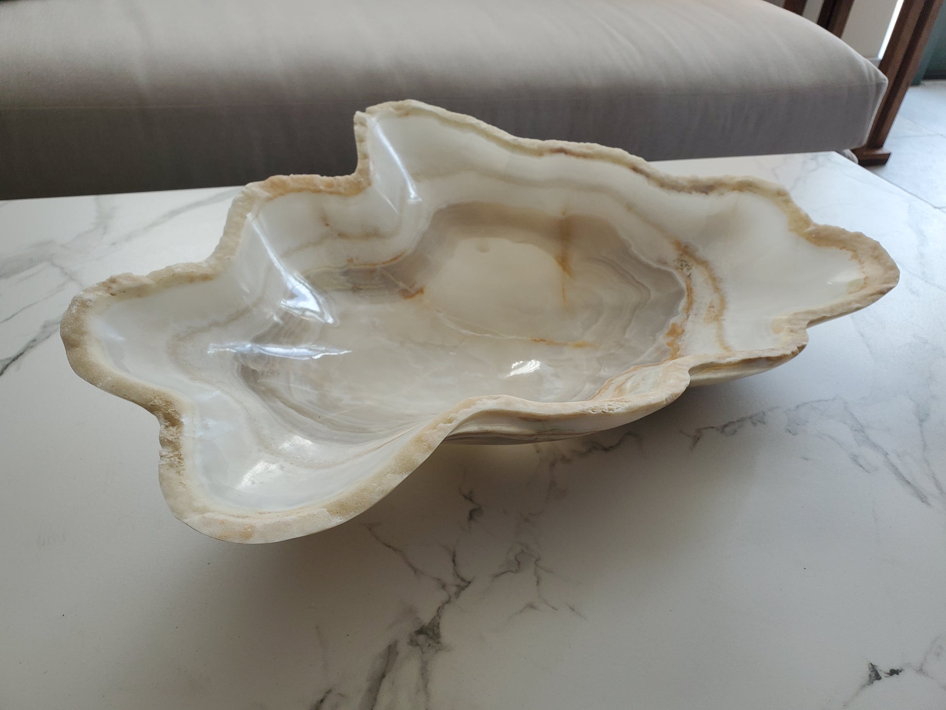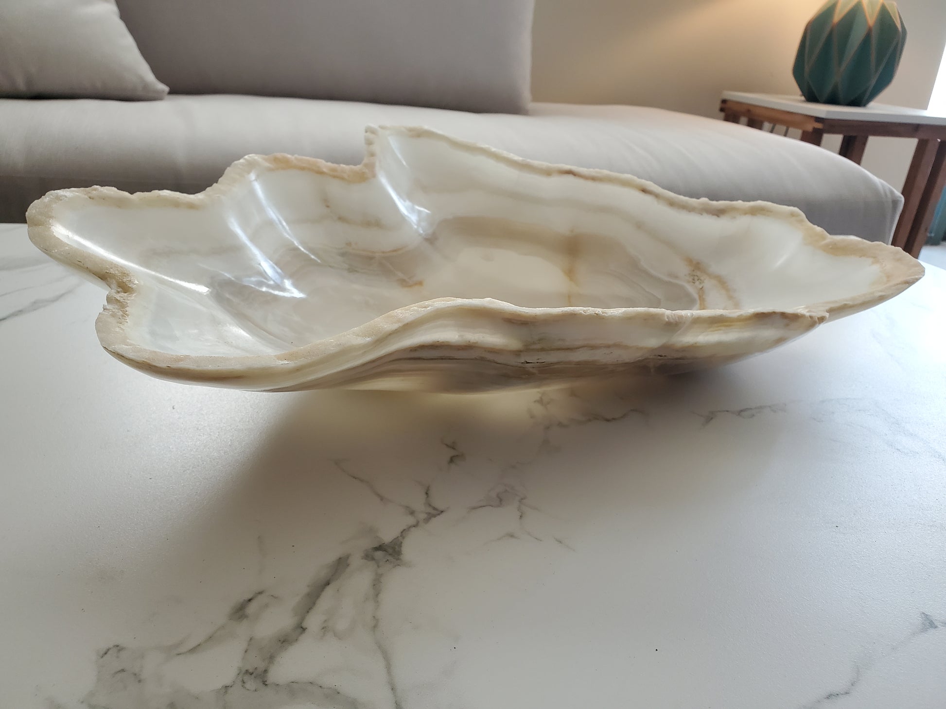 White and beige handcrafted onyx centerpiece. This precious stone has been carefully crafted for millions of years by the artisans that are our Mexican volcanoes. Each piece is unique in its nature. No extracted stone is the same as another. Our Mexican artists make sure to pick the most beautiful samples from our volcanic deposits, and therefore craft beautiful pieces of art.