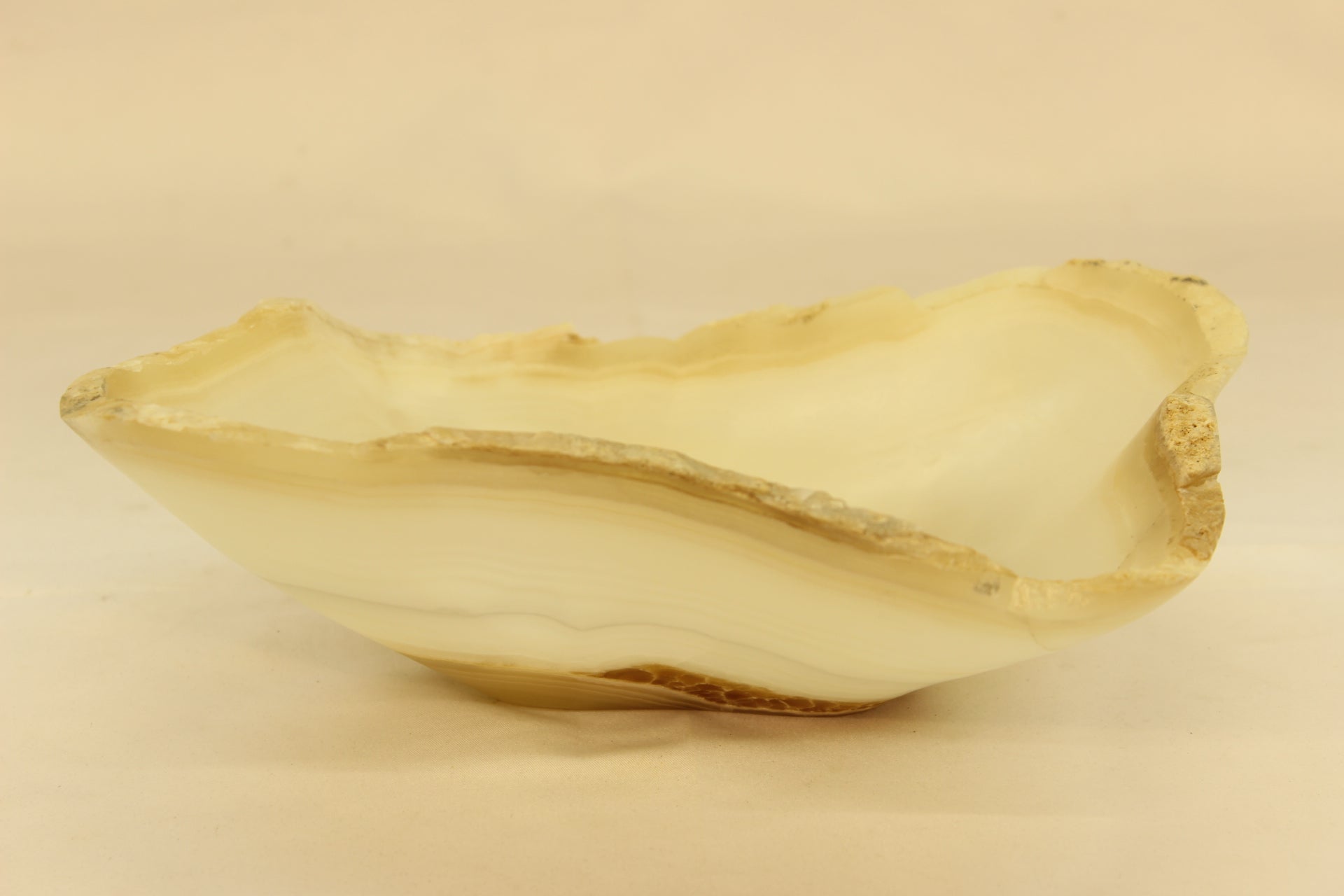 Beige and brown handcrafted onyx centerpiece. This precious stone has been carefully crafted for millions of years by the artisans that are our Mexican volcanoes. Each piece is unique in its nature. No extracted stone is the same as another. Our Mexican artists make sure to pick the most beautiful samples from our volcanic deposits, and therefore craft astonishing pieces of art.